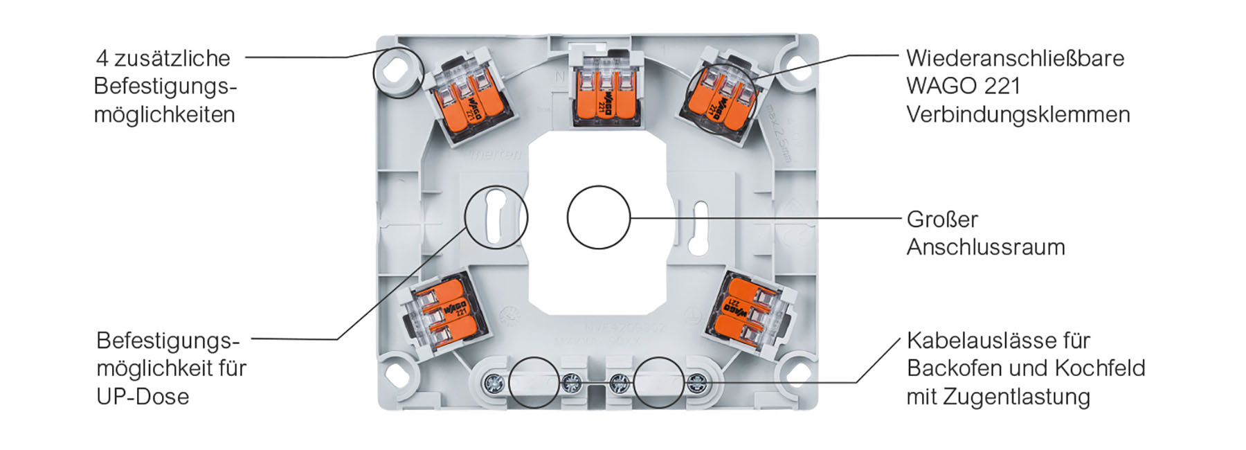 Im Fokus steht unsere Merten Herdanschlussdose mit vielen praktischen Features – eine zuverlässige Lösung für den sicheren Anschluss in der Küche und ein fester Bestandteil vieler Installationen. Der große Anschlussraum und die großzügige Öffnung für die Kabeleinführung sorgen für ausreichend Platz zur komfortablen Montage.