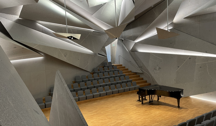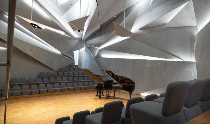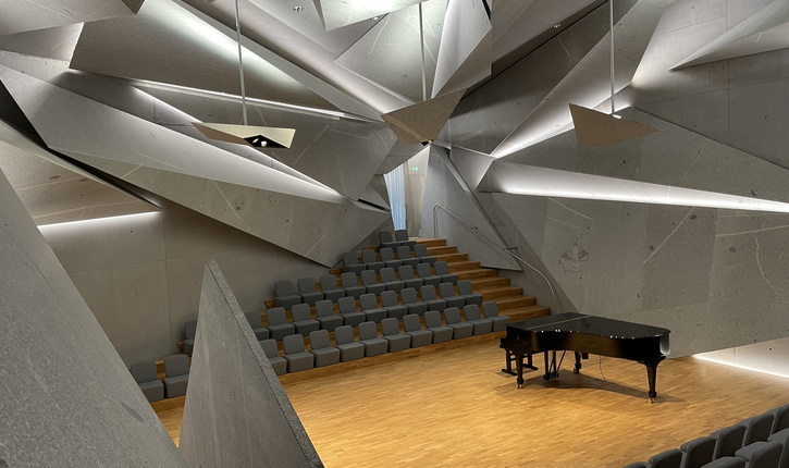 Im viereinhalb Meter unter der Erde neu gebauten Unterrichts- und Konzertsaal – einer Weltneuheit – präsentieren die Studentinnen und Studenten seit Sommer 2021 ihre Abschlusskonzerte. Er besticht durch seine spektakuläre Architektur mit 33 riesigen und tonnenschweren Granitspitzen, seine hervorragende Akustik sowie ein atmosphärisches Lichtspiel.